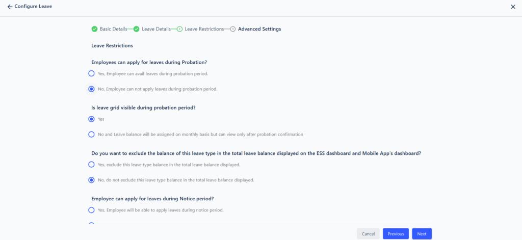 It is possible to implement a policy that restricts employees in Probation from applying for leave. This can be configured through the Leave Rule settings, helping ensure that new employees remain focused during their initial period.